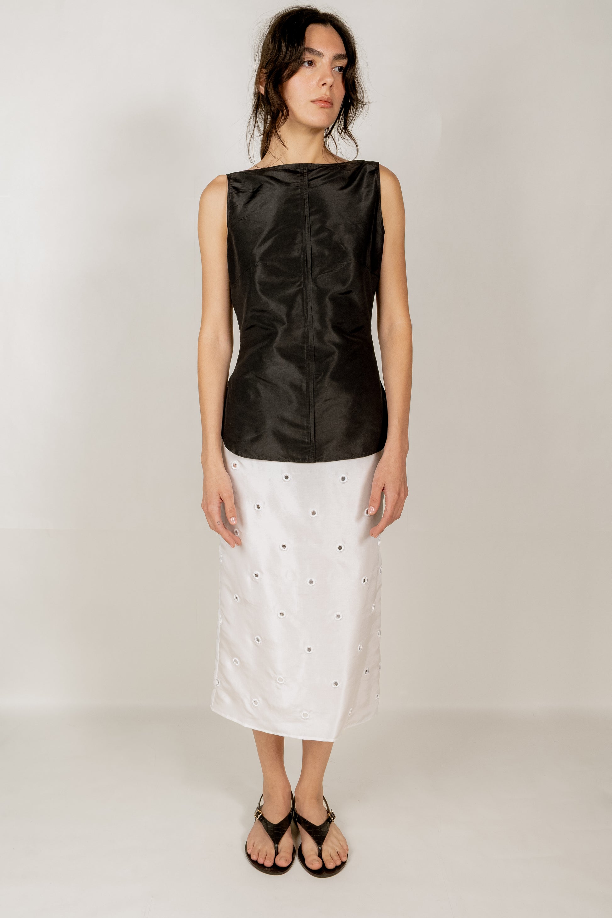 Wrapped in the gentle embrace of minimalism, the Da Skirt in luminous ivory with mirror details exudes a quiet sophistication. A design that speaks volumes through its simplicity, blending beauty with purpose.