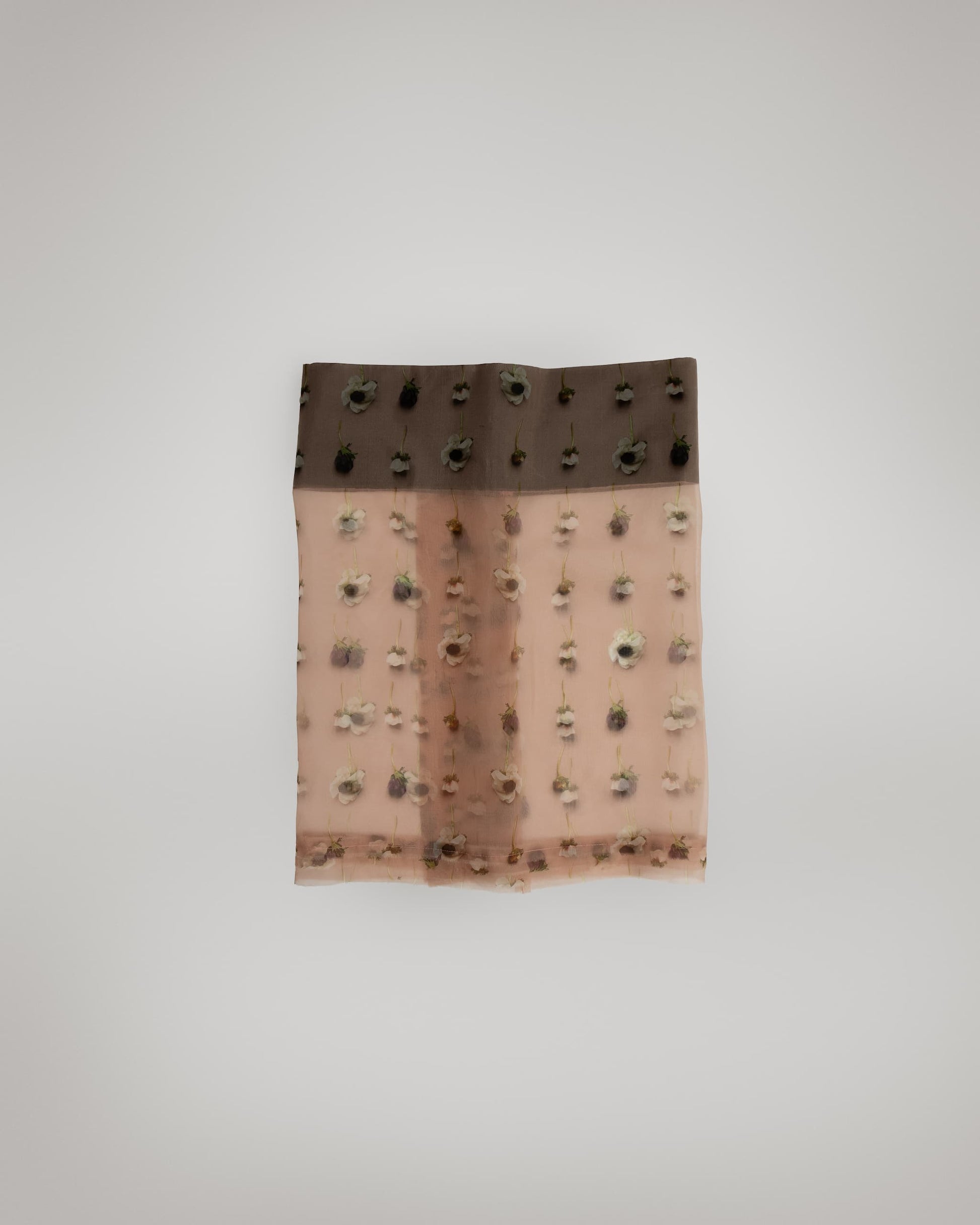 A raw hem with a retention stitch adds texture, grounding the delicacy of the fabric with quiet control. The result is both vivid and restrained—a dialogue between print, form, and air.