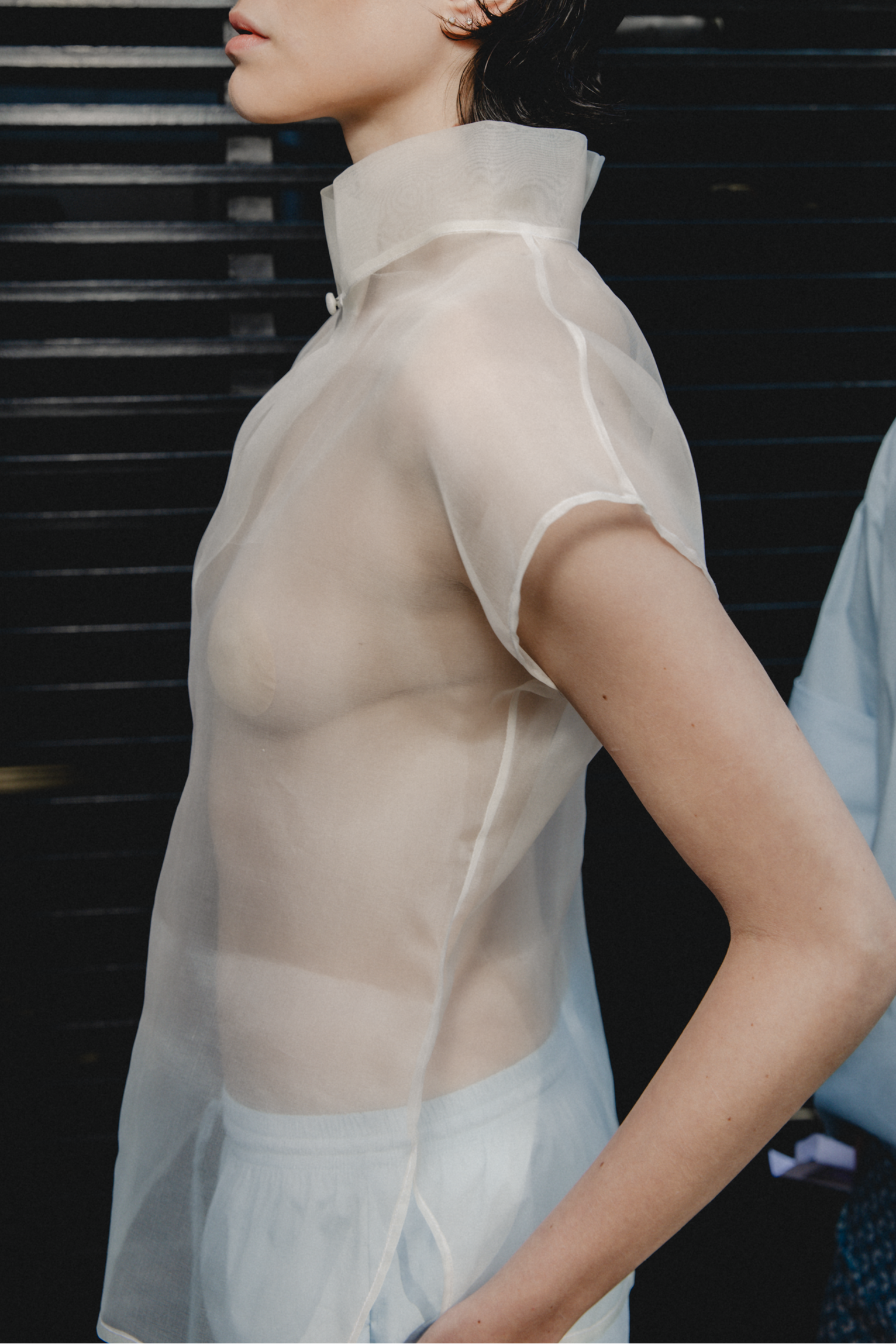 The ELA Top features a high neckline cut from a single piece, closing at the back with a self-covered button for a refined, uninterrupted line. A central opening extends from the neck to the bust, creating a controlled V-shaped slit that balances openness with precision.