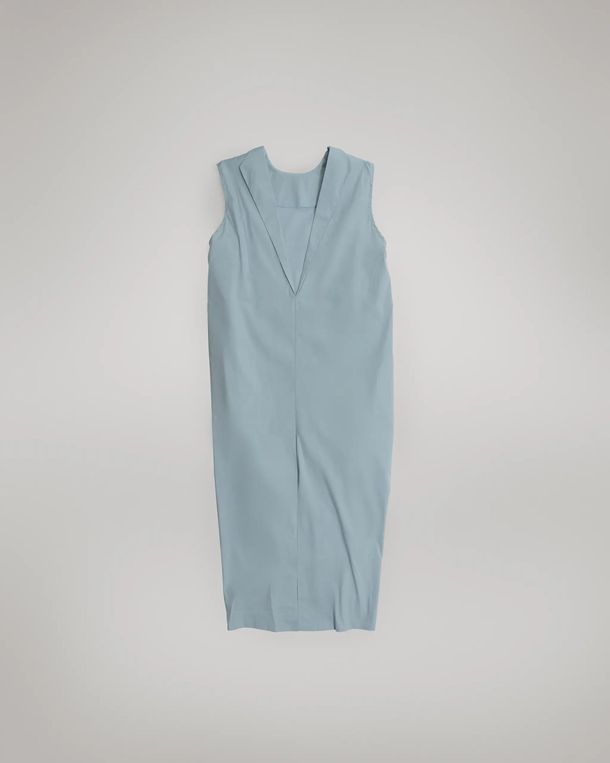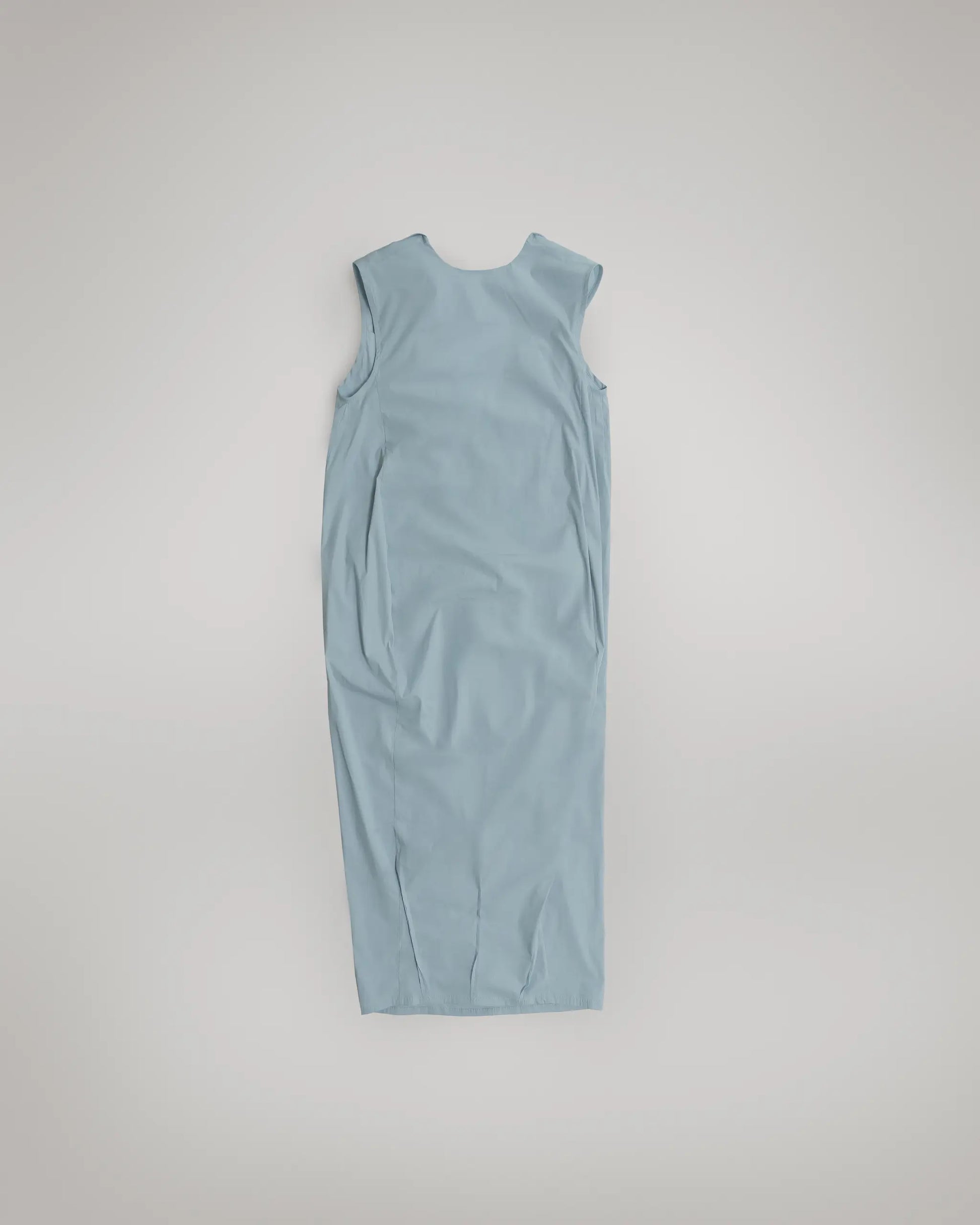 Crafted in ice-blue Supima cotton, the ELI Dress presents a balanced front silhouette—structured yet fluid—with hidden pockets integrated seamlessly into the front seams. From these lines, the fabric expands outward, creating a subtle balloon shape that moves with quiet intention.