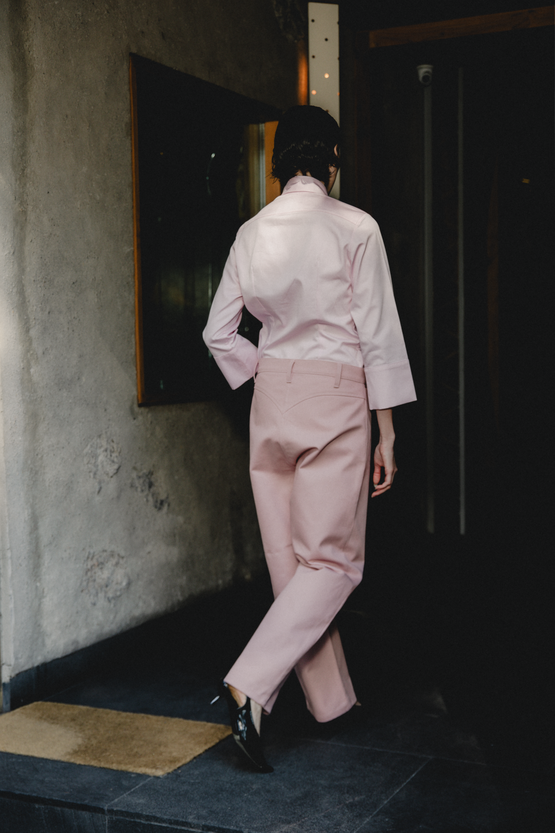 The Form Shirt features a close, form-fitting silhouette that contours the torso with precision. The front is minimal and uninterrupted, anchored by a classic pointed collar and a straight row of tonal buttons. Three-quarter sleeves end in a turned cuff, adding subtle volume and balance to the fitted body.