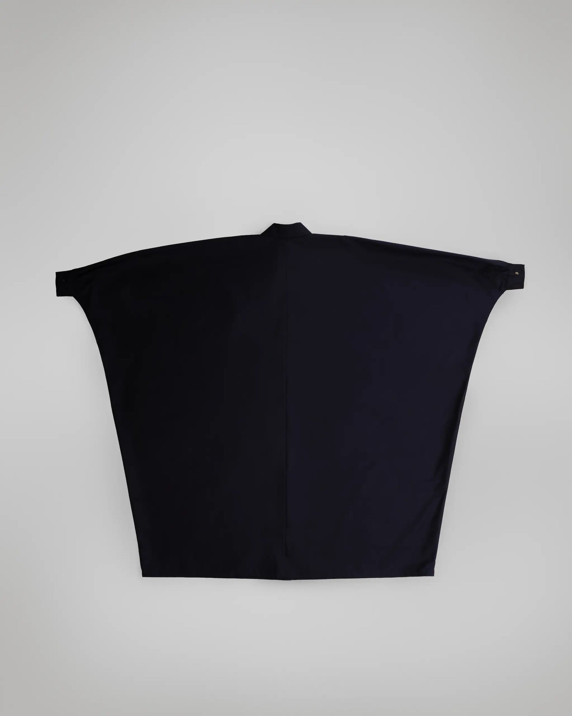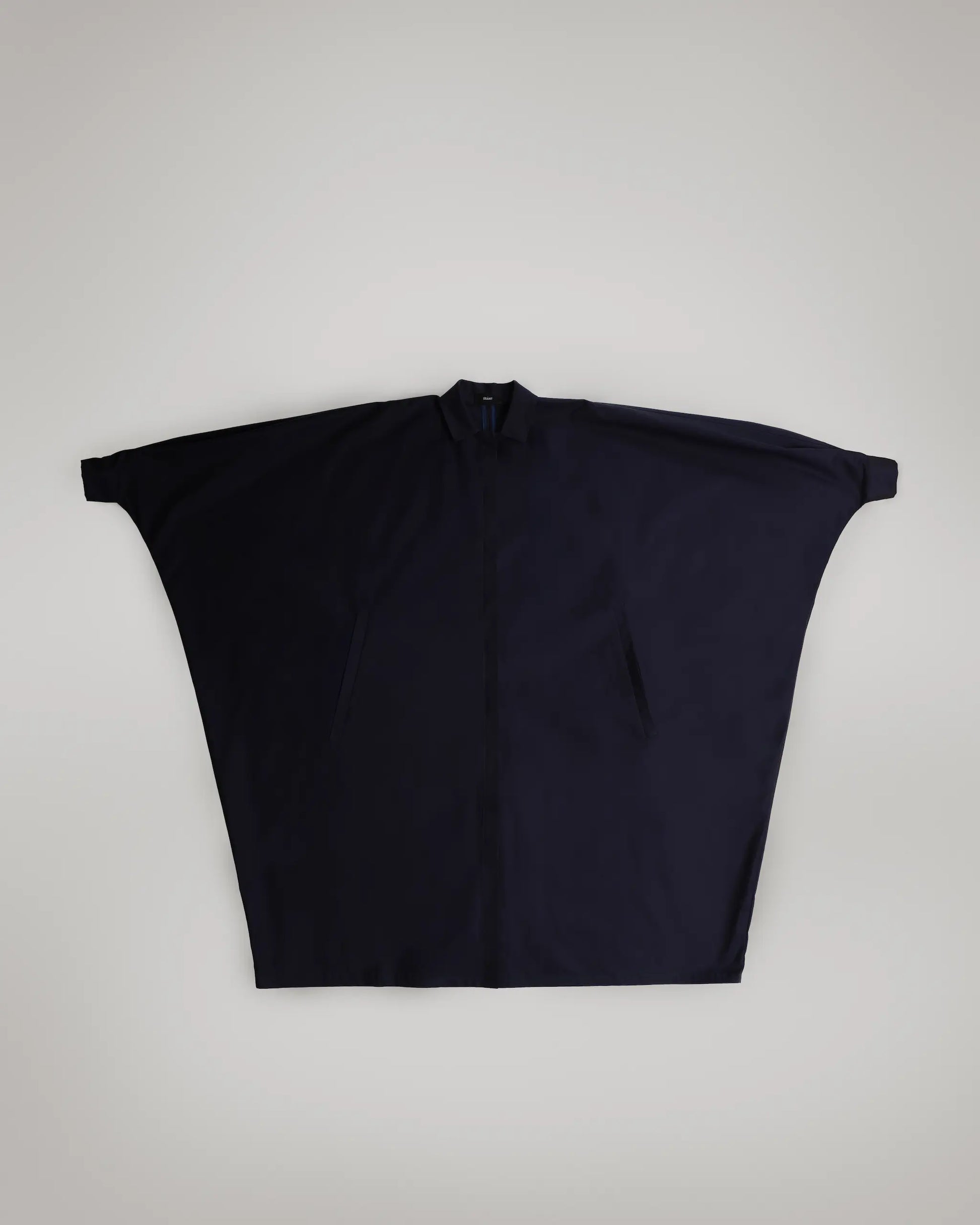 Falling in a circular line rather than a straight cut, it envelops the body with soft volume and quiet strength. The fabric’s weight brings definition to its curved shape, balancing precision with ease while providing protection against the elements.