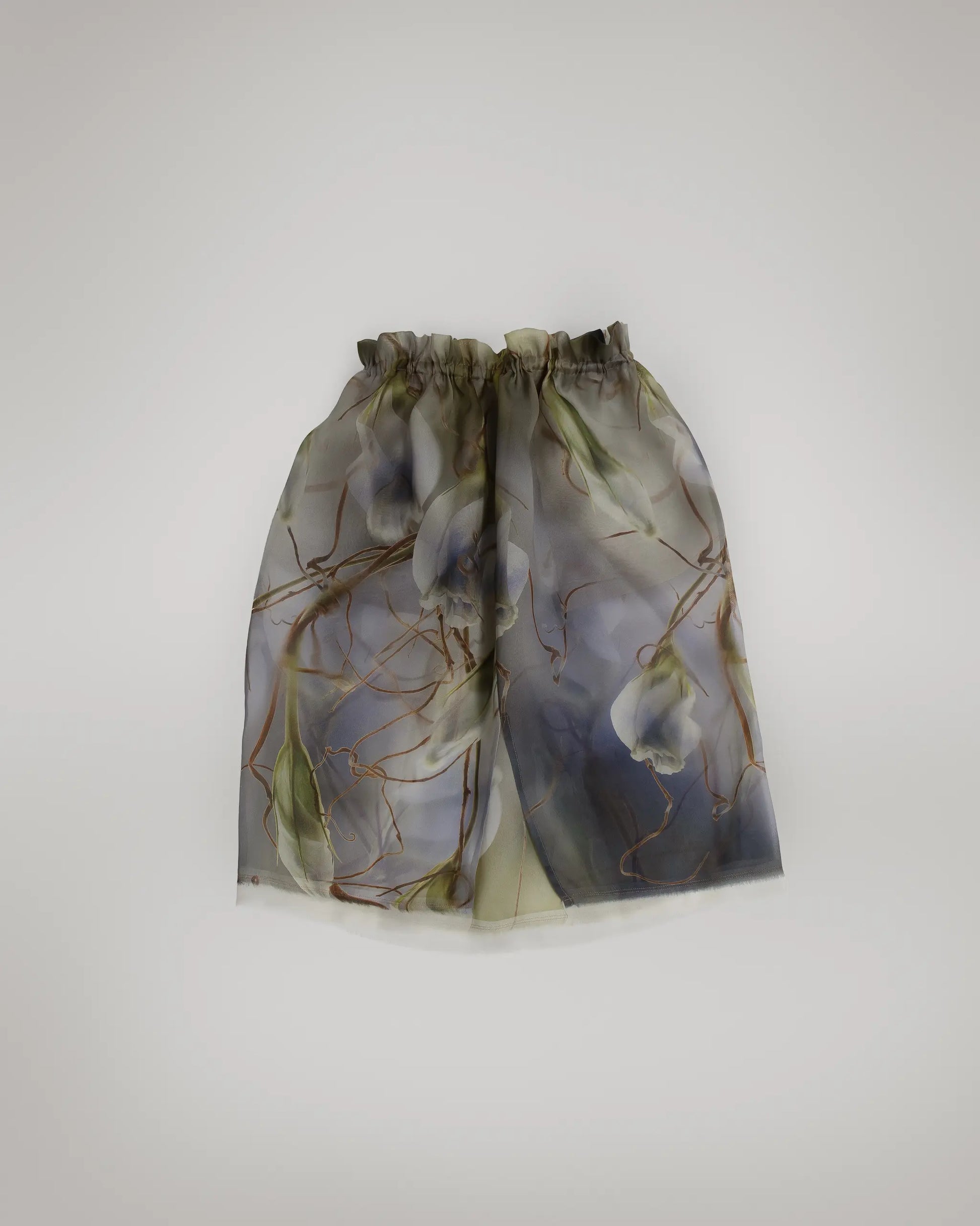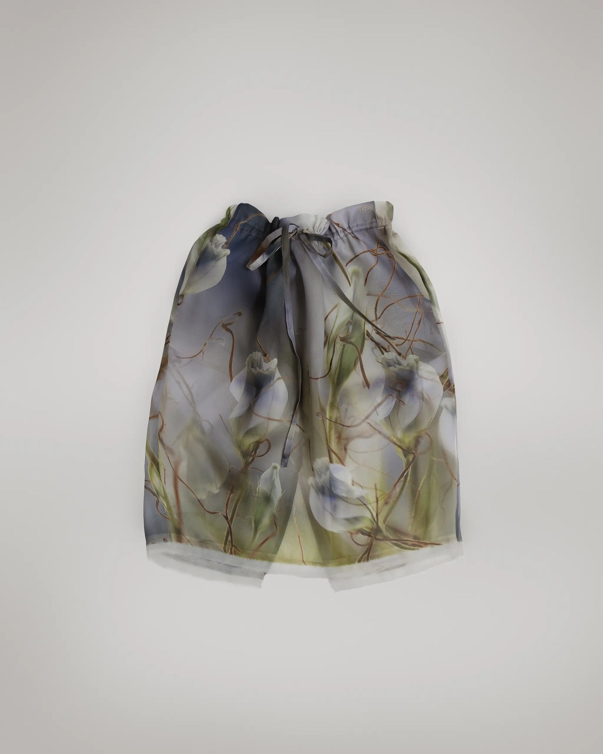 Crafted in printed silk organza, the HEDY Skirt transforms a utilitarian silhouette into something fluid and weightless. Falling just below the knee, its straight shape contrasts with the lightness of the fabric, allowing the print to move softly with each step.