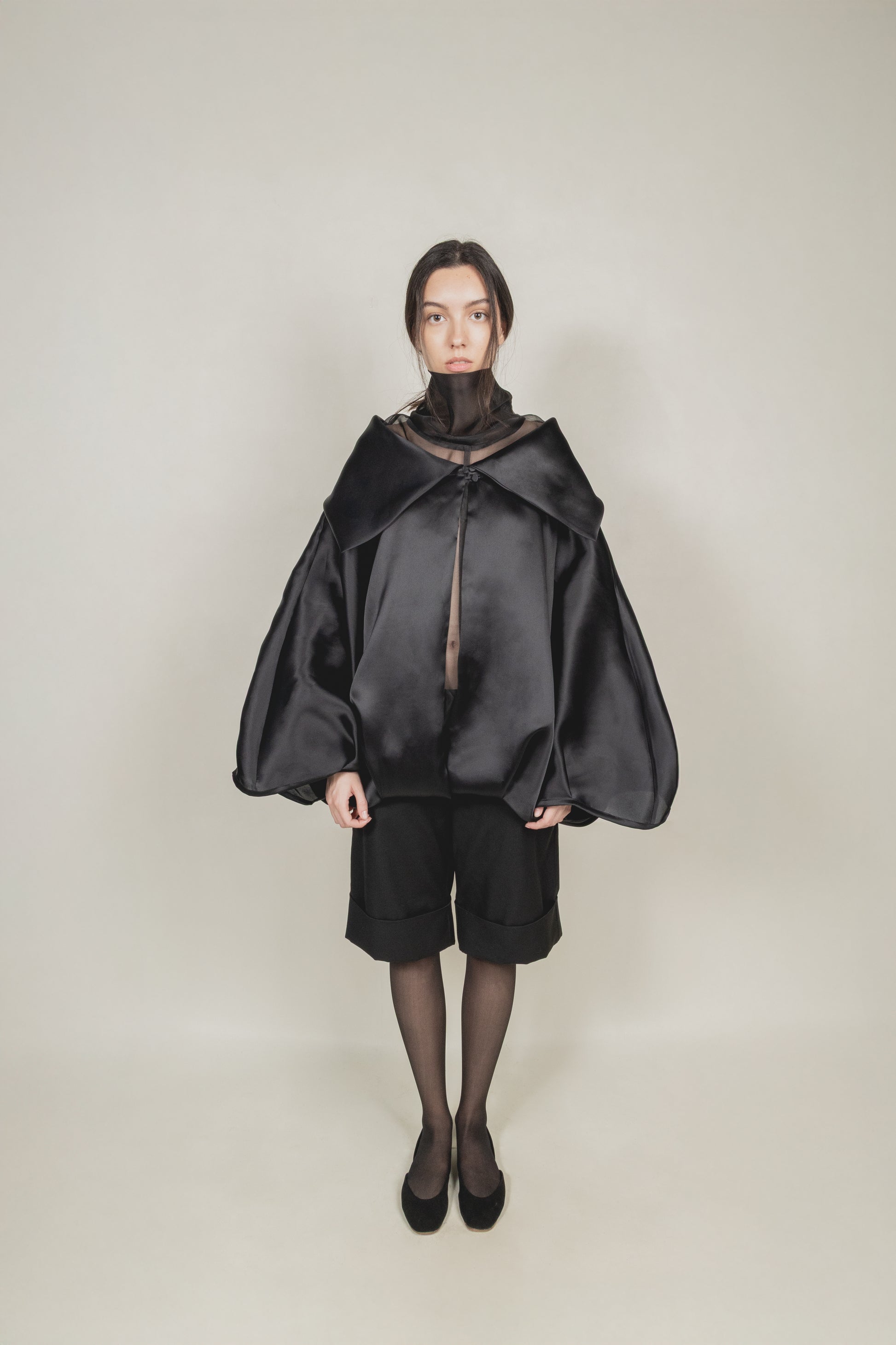 This voluminous cape is an ode to shape and lightness, crafted entirely in organza to create a silhouette that feels both sculptural and weightless. Falling just below the shoulders, it frames the upper body in a flattering, open line. A dramatic, oversized lapel defines the piece — folding softly around the back and cascading forward like a collar, adding movement and unexpected structure. Fastened by two subtle buttons at the front, the cape envelops the body with oversized sleeves and a balloon-shaped hem that holds its form with quiet drama. Available in soft baby pink and deep black — two shades, one statement.