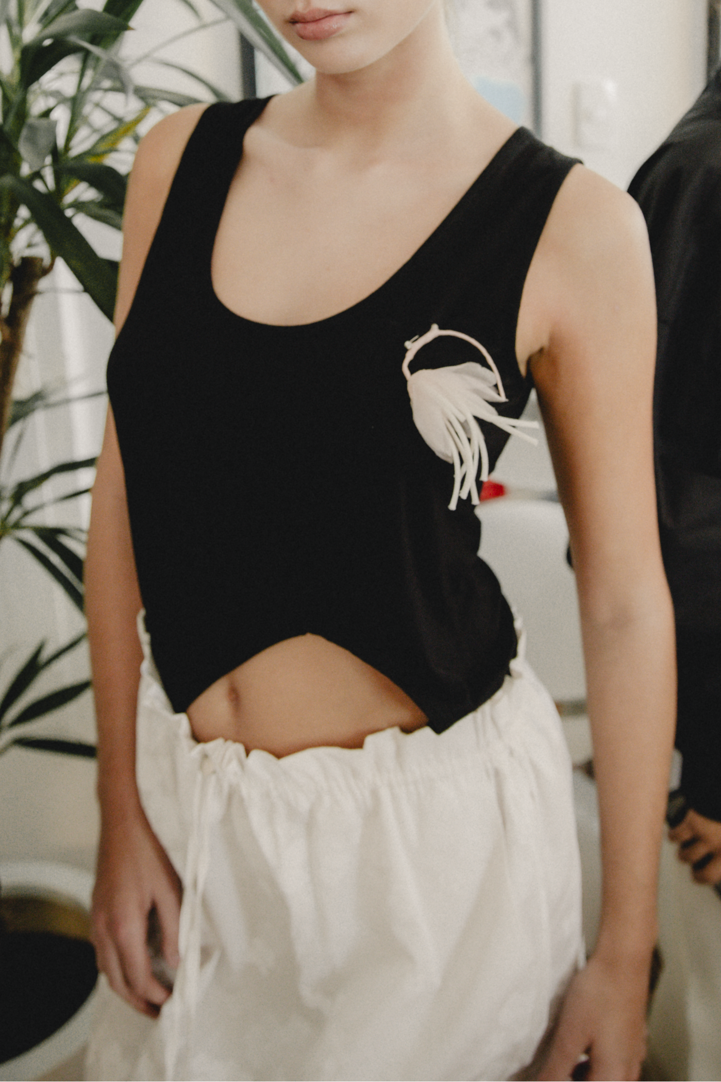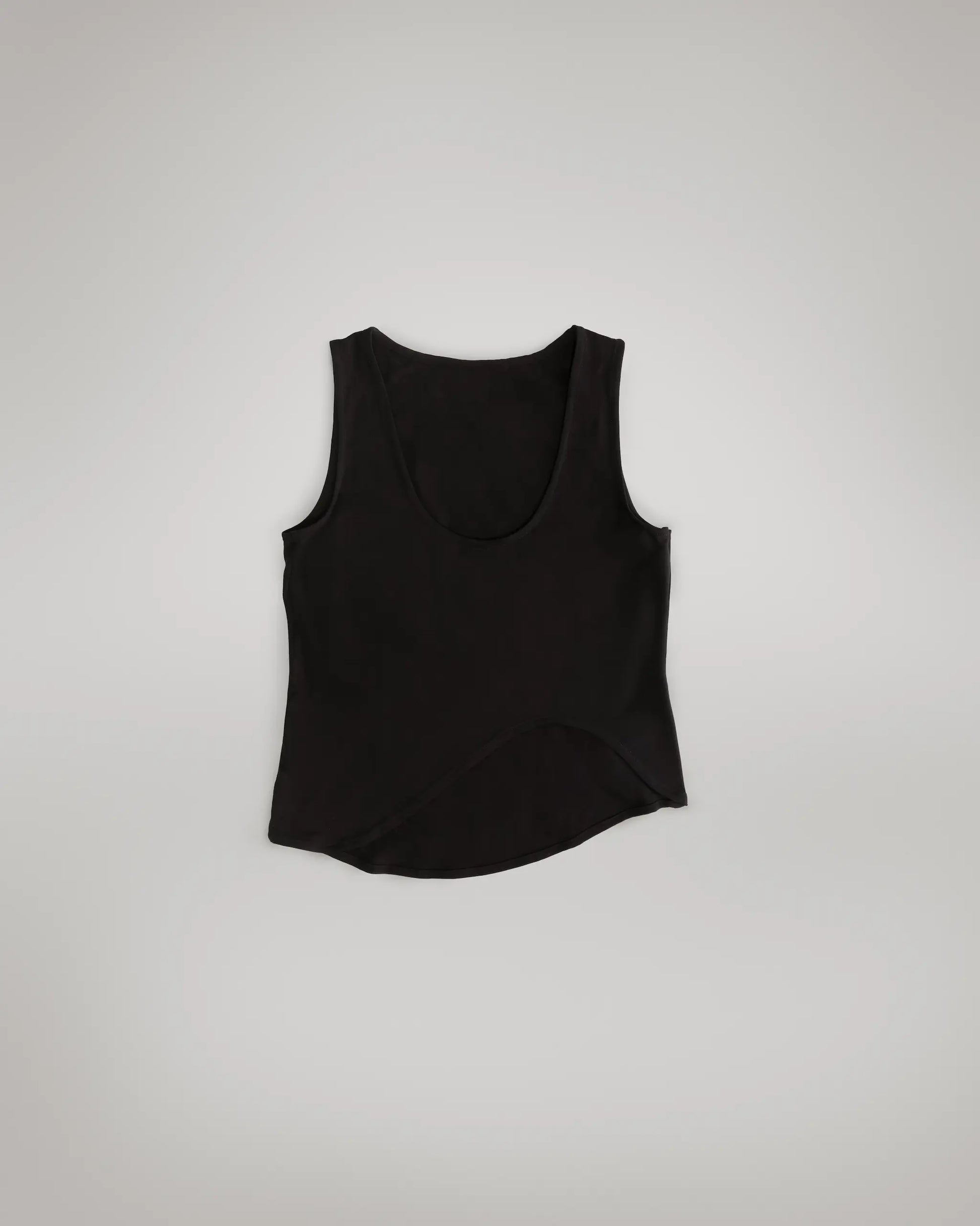 The JO Top reveals a side cut that traces the natural curve of the body, offering glimpses of skin and the subtle outline of the hip bone, while maintaining a balanced proportion that conceals the navel.