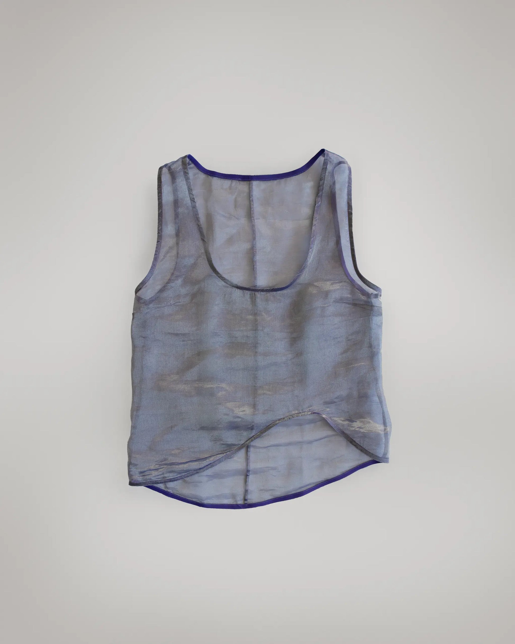 The JO Top reveals a side cut that traces the natural curve of the body, offering glimpses of skin and the subtle outline of the hip bone, while maintaining a balanced proportion that conceals the navel.