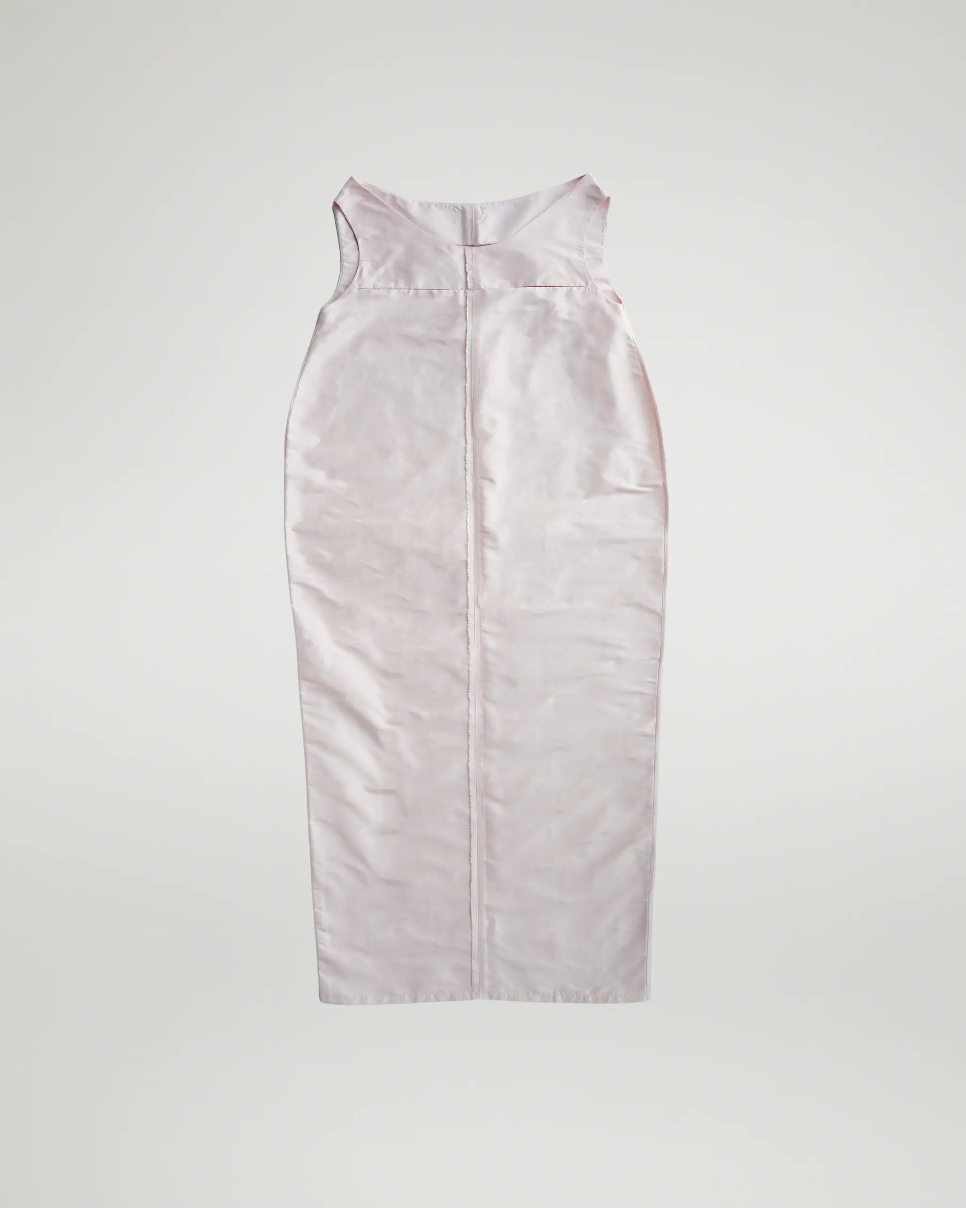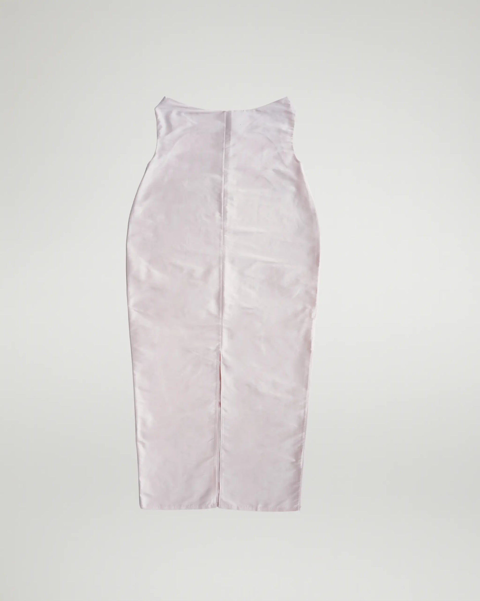 The straps drape loosely over the shoulders, resting at a mid-shoulder position for a naturally softened line. At the back, a discreet slit ensures ease of movement and reinforces the dress’s effortless flow.