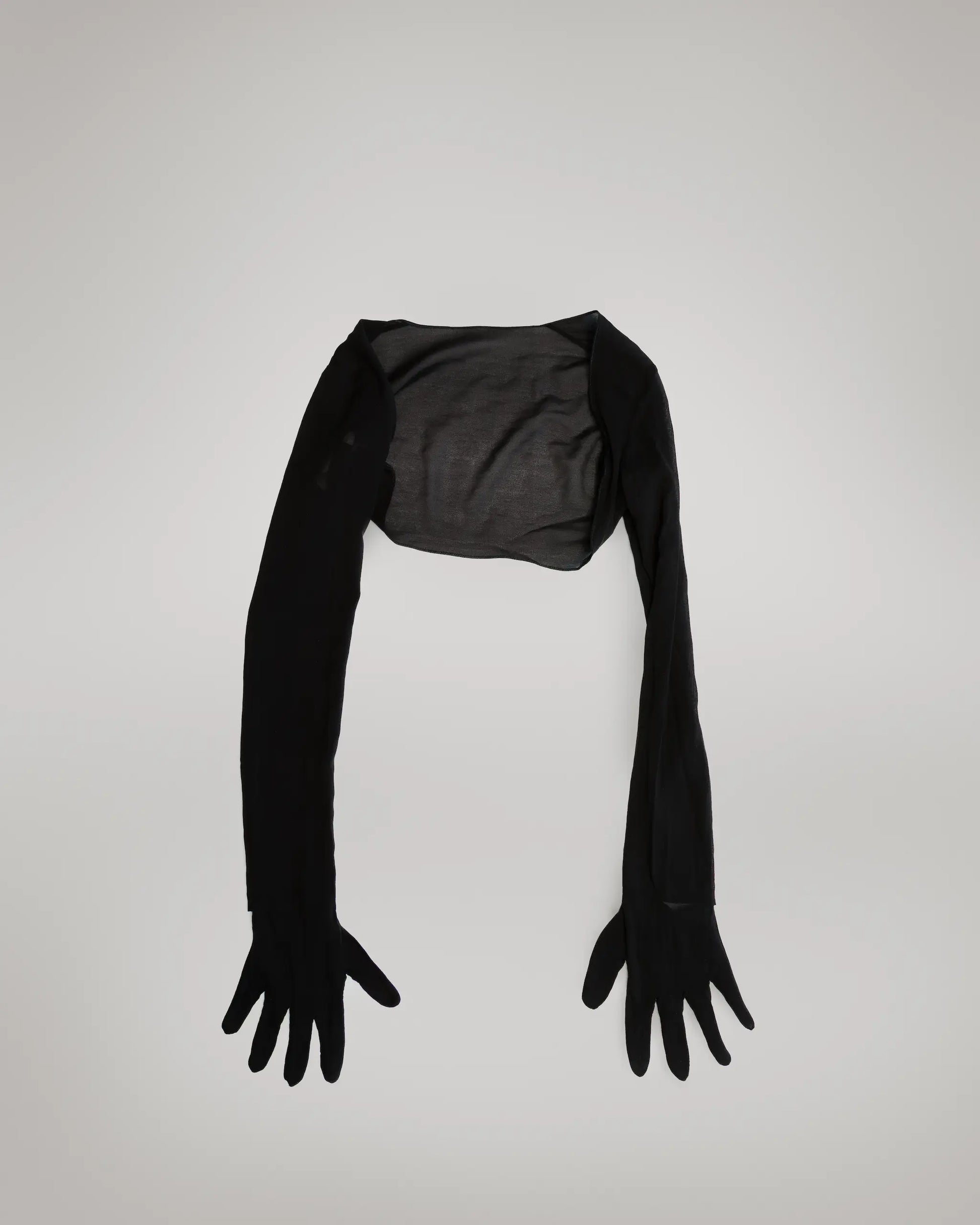 A sculptural layer defined by line and gesture. The Manos Bolero wraps the upper body with a sheer, lightweight panel that sits across the shoulders, extending into elongated gloves that flow seamlessly from the sleeves. The silhouette traces the arms with precision, creating a continuous, expressive shape that feels both delicate and assertive.