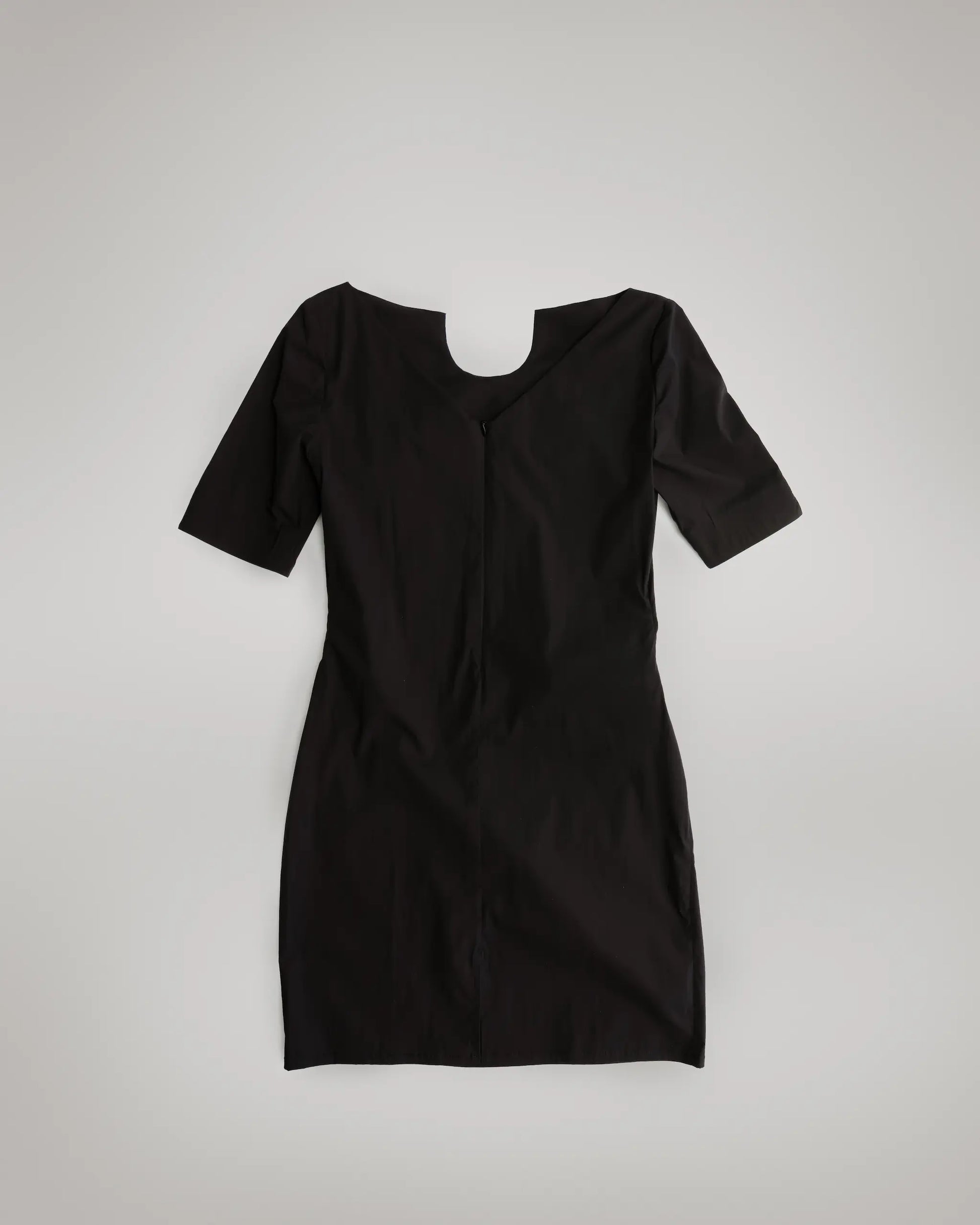 The MAUDE Dress features a soft bateau neckline and ¾-length sleeves that frame the upper body with quiet structure. Below the waist, a clean horizontal slit extends from seam to seam—placed just beneath the navel—to reveal a discreet line of skin.