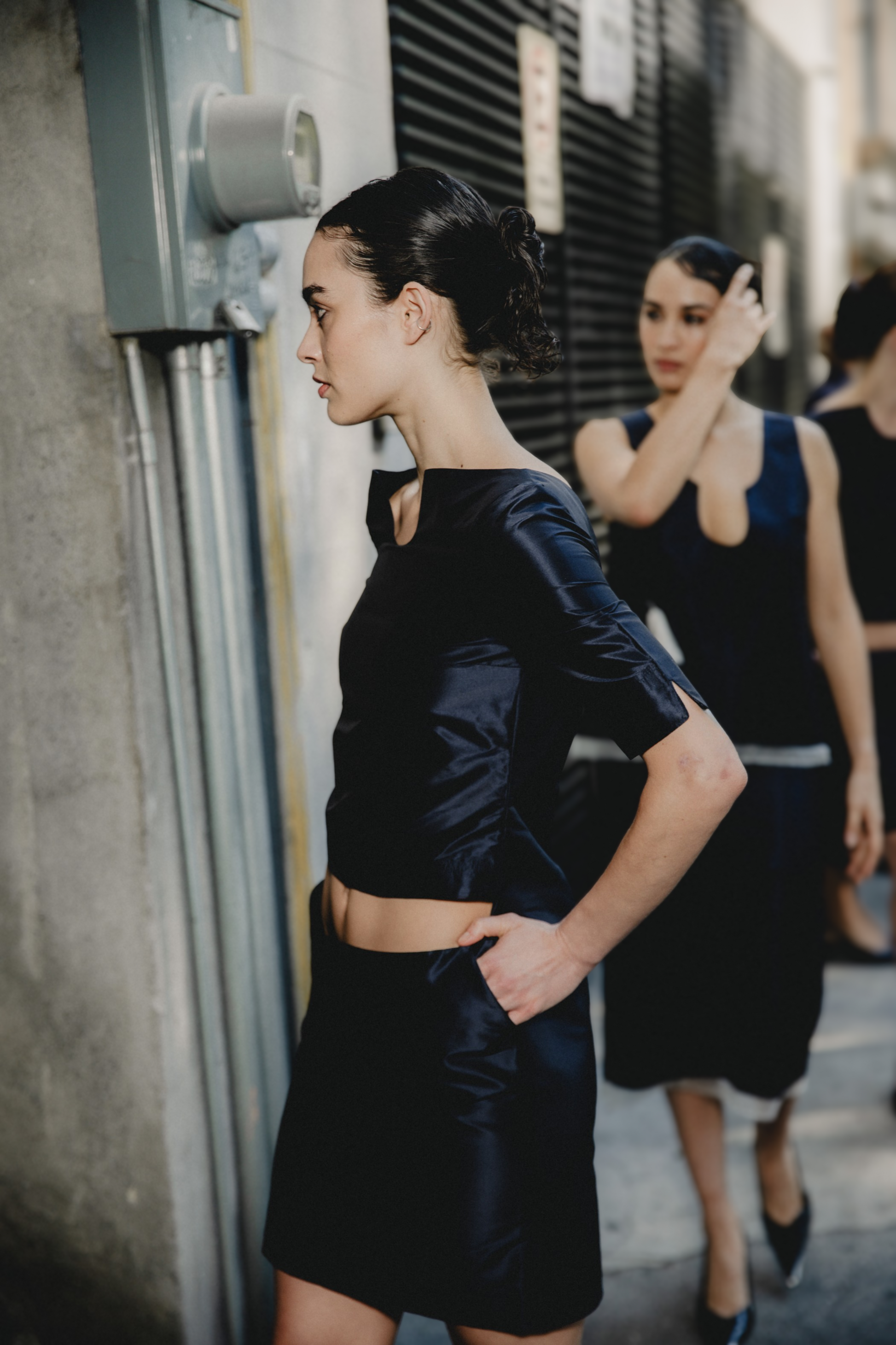 The MAUDE Dress features a soft bateau neckline and ¾-length sleeves that frame the upper body with quiet structure. Below the waist, a clean horizontal slit extends from seam to seam—placed just beneath the navel—to reveal a discreet line of skin.