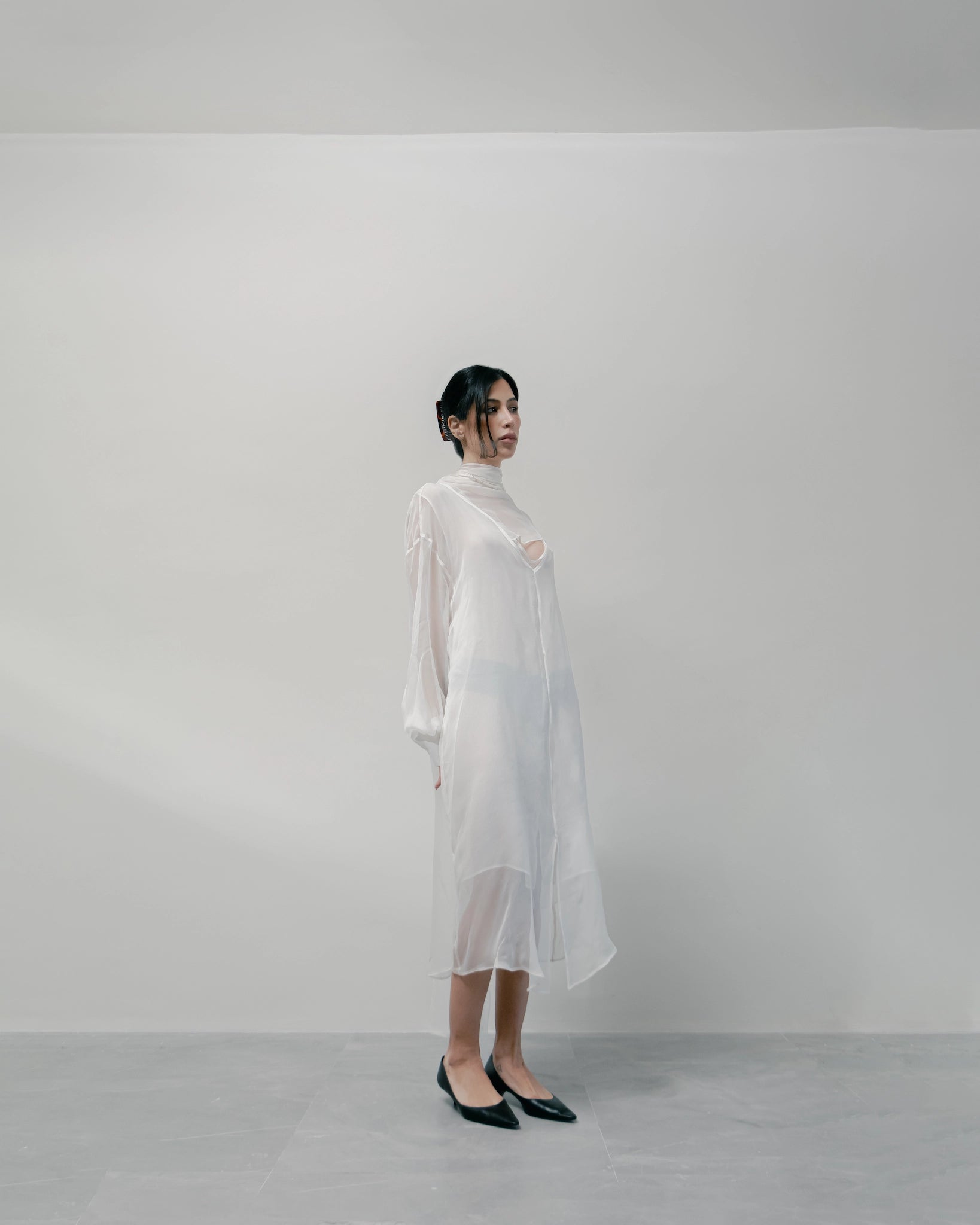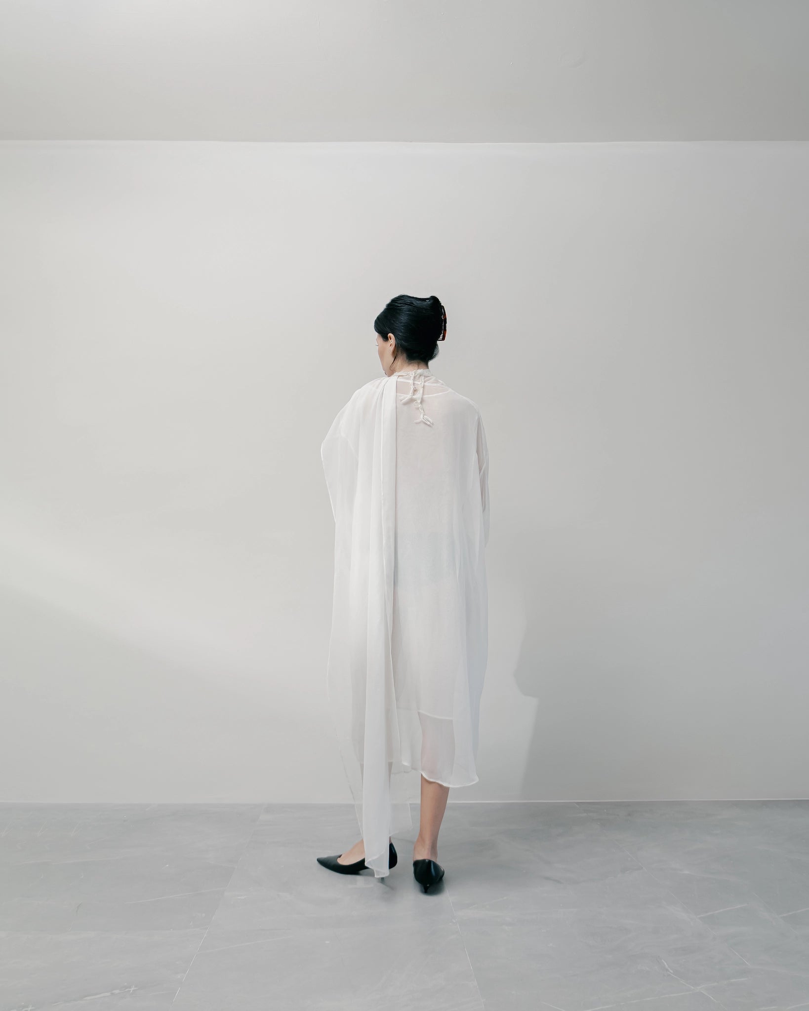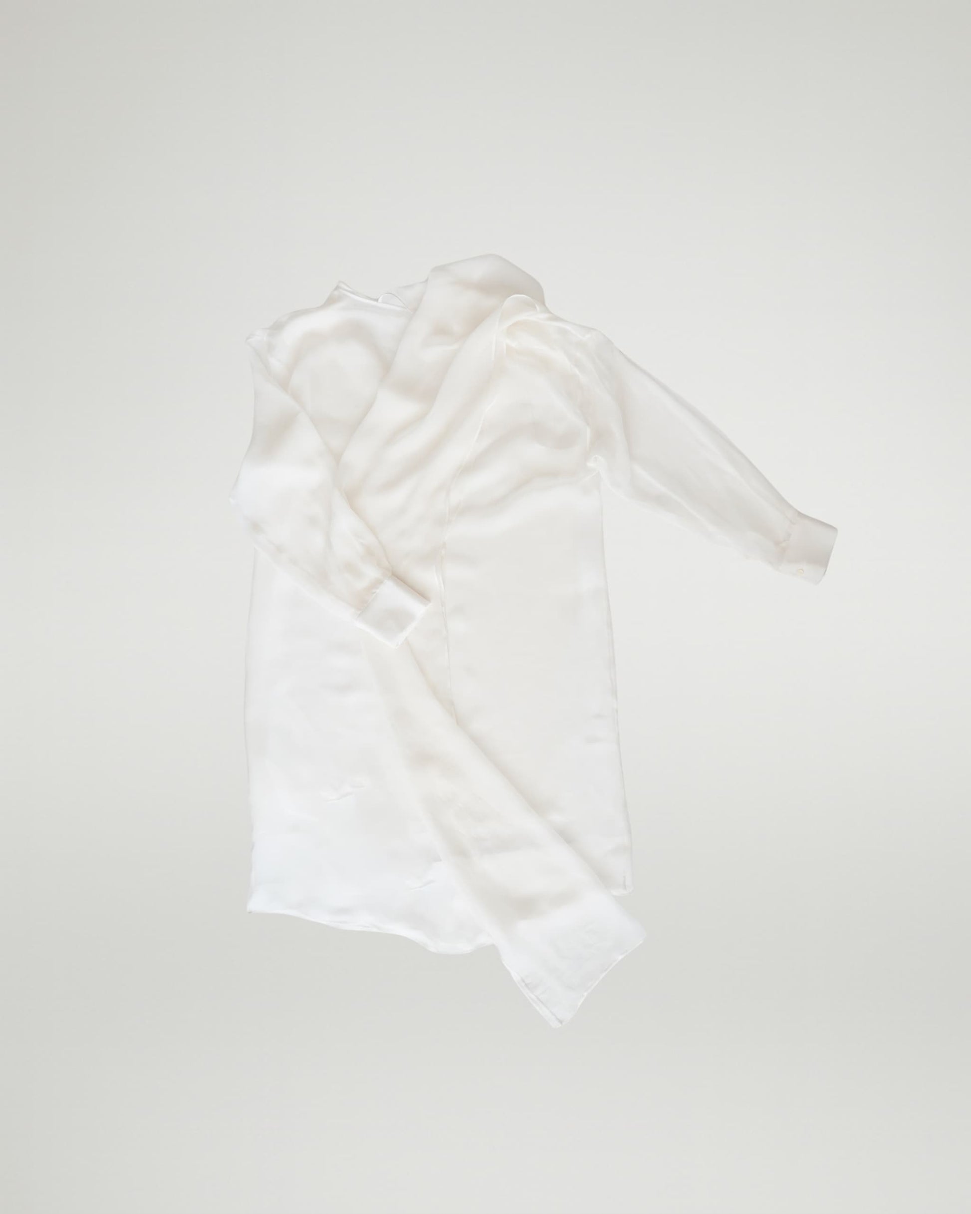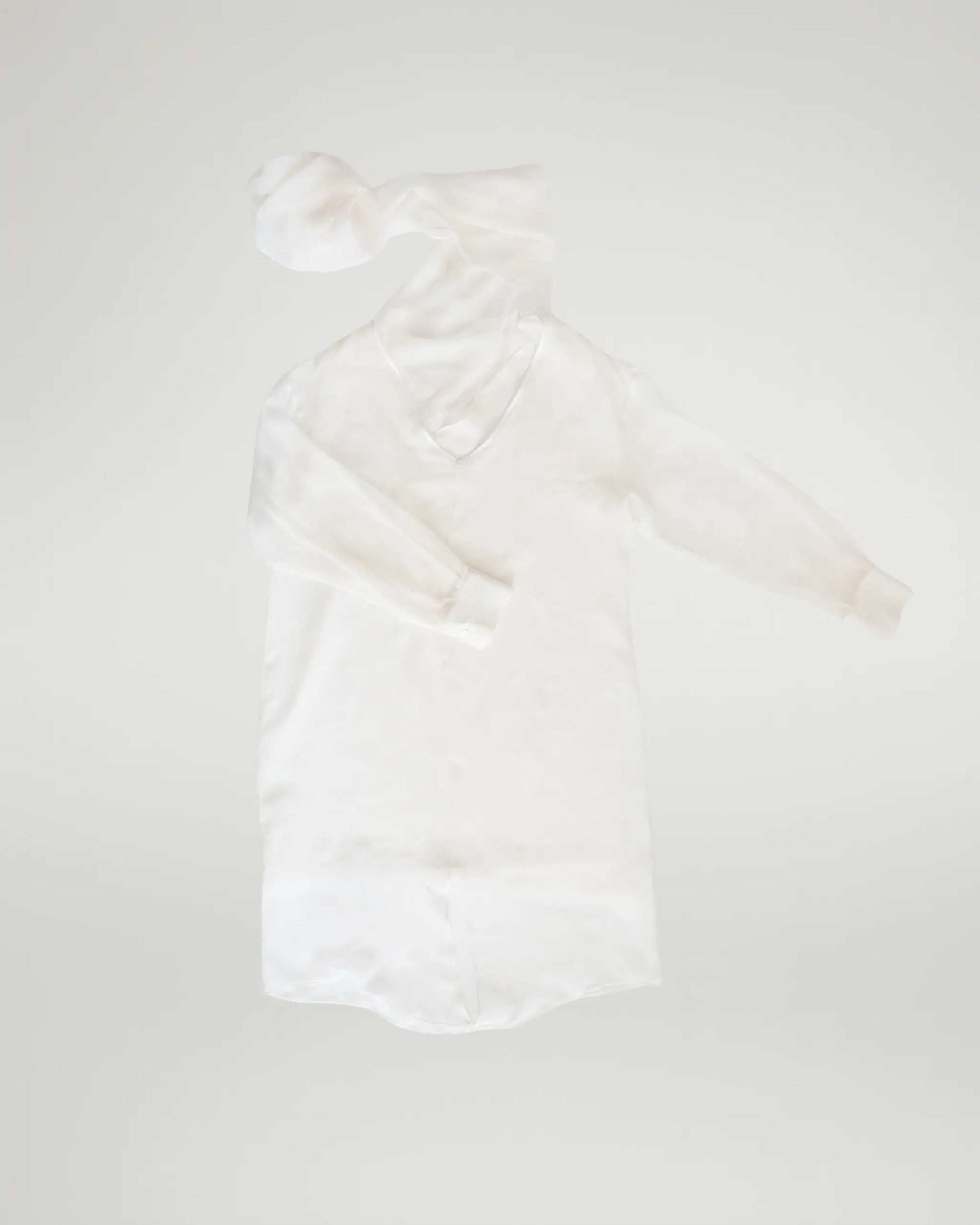 The Nara Dress carries the same oversized, relaxed silhouette as the top, now extended into a clean, elongated dress. An integrated triangular scarf emerges from the neckline, attached only at one end, allowing it to drape freely or be adjusted without separating from the piece.