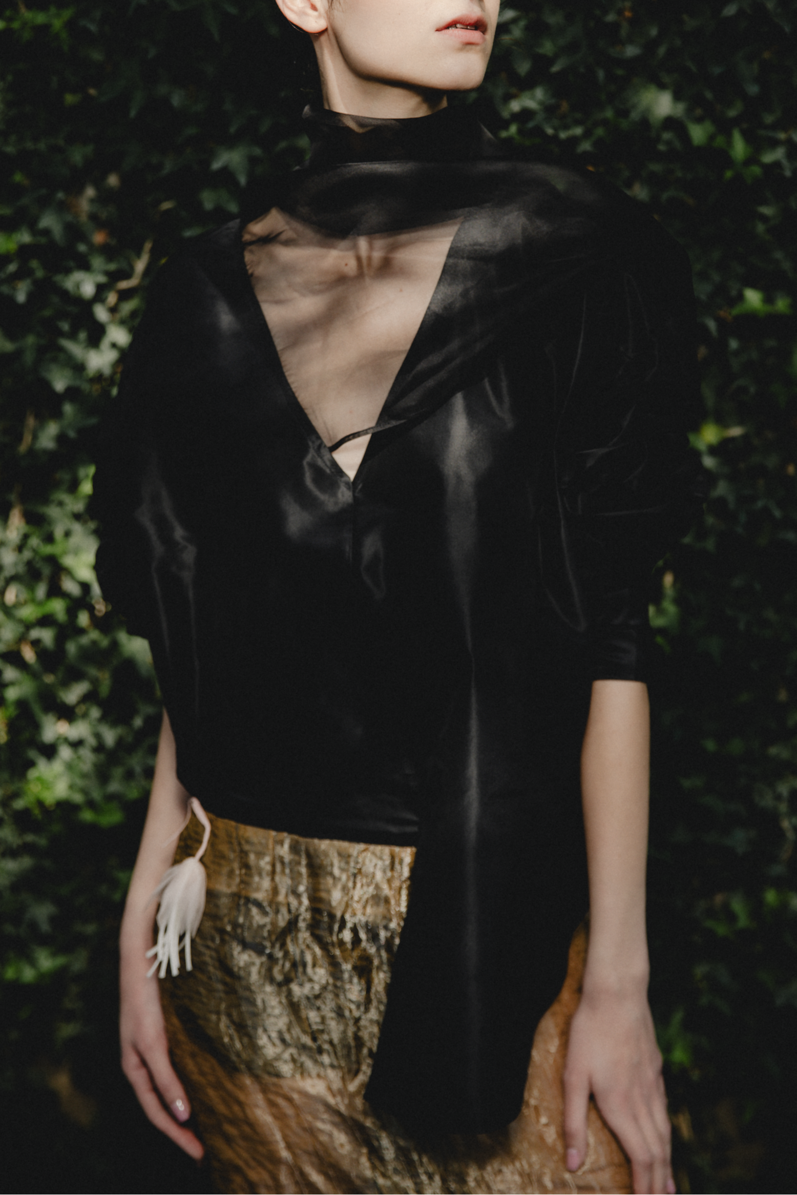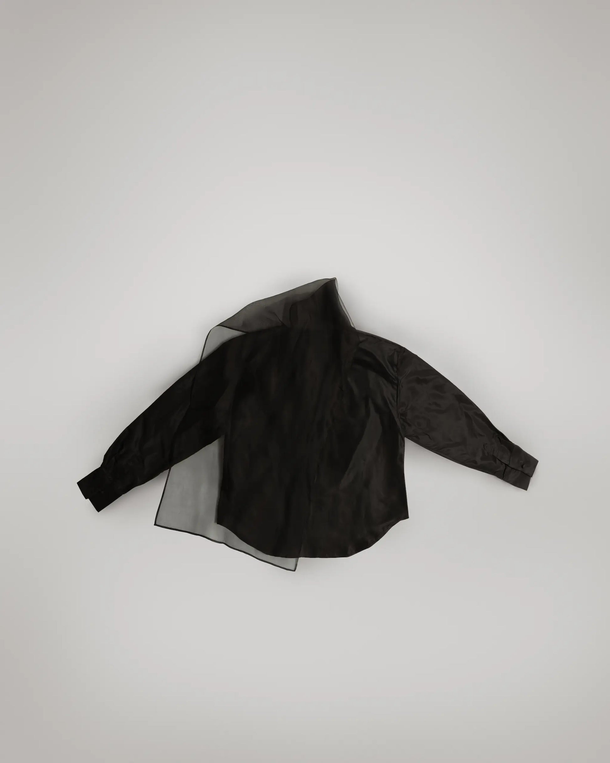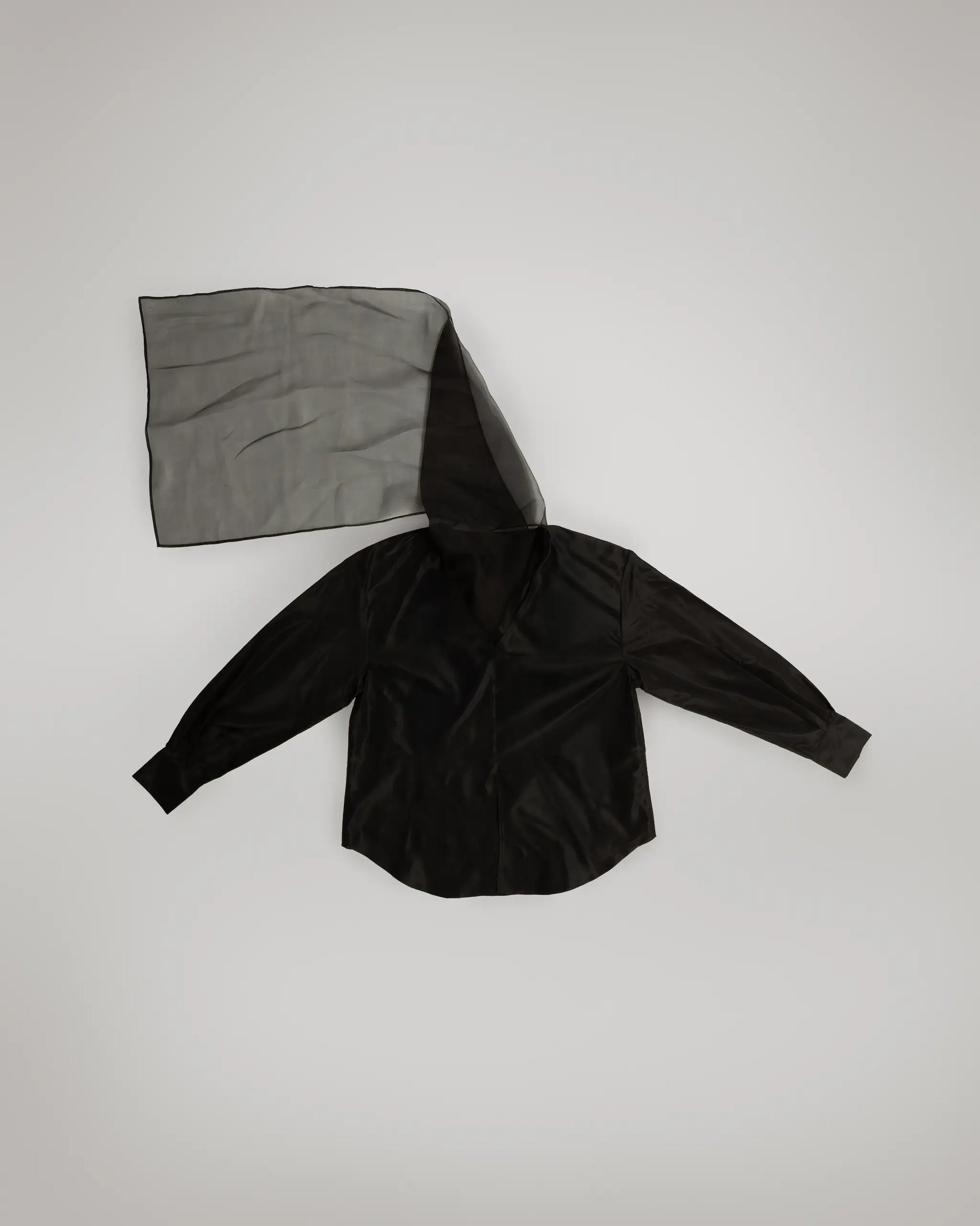The NARA Top is an oversized shirt with a relaxed silhouette that balances ease and intention. An integrated scarf extends from the neckline in a triangular shape, attached only at one end, allowing it to drape freely or be adjusted without separating from the garment.