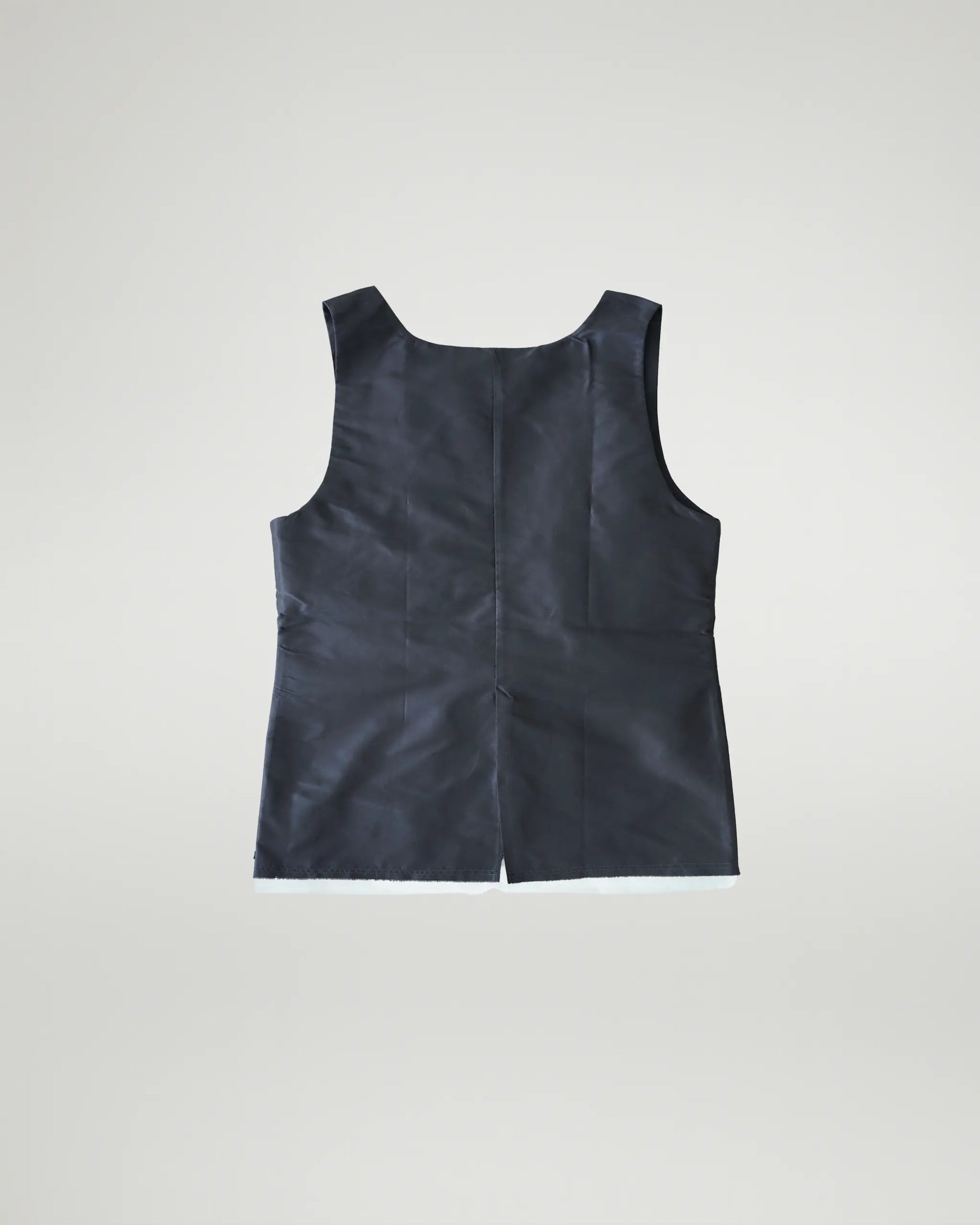 The Nelly Top features a neckline reminiscent of the Margo silhouette, but extended lower to reveal the sternum with a clean, elongated curve. A central seam runs down the front, finished with a subtle, controlled fray that exposes the fabric’s edge—an intentional contrast to its structured form.