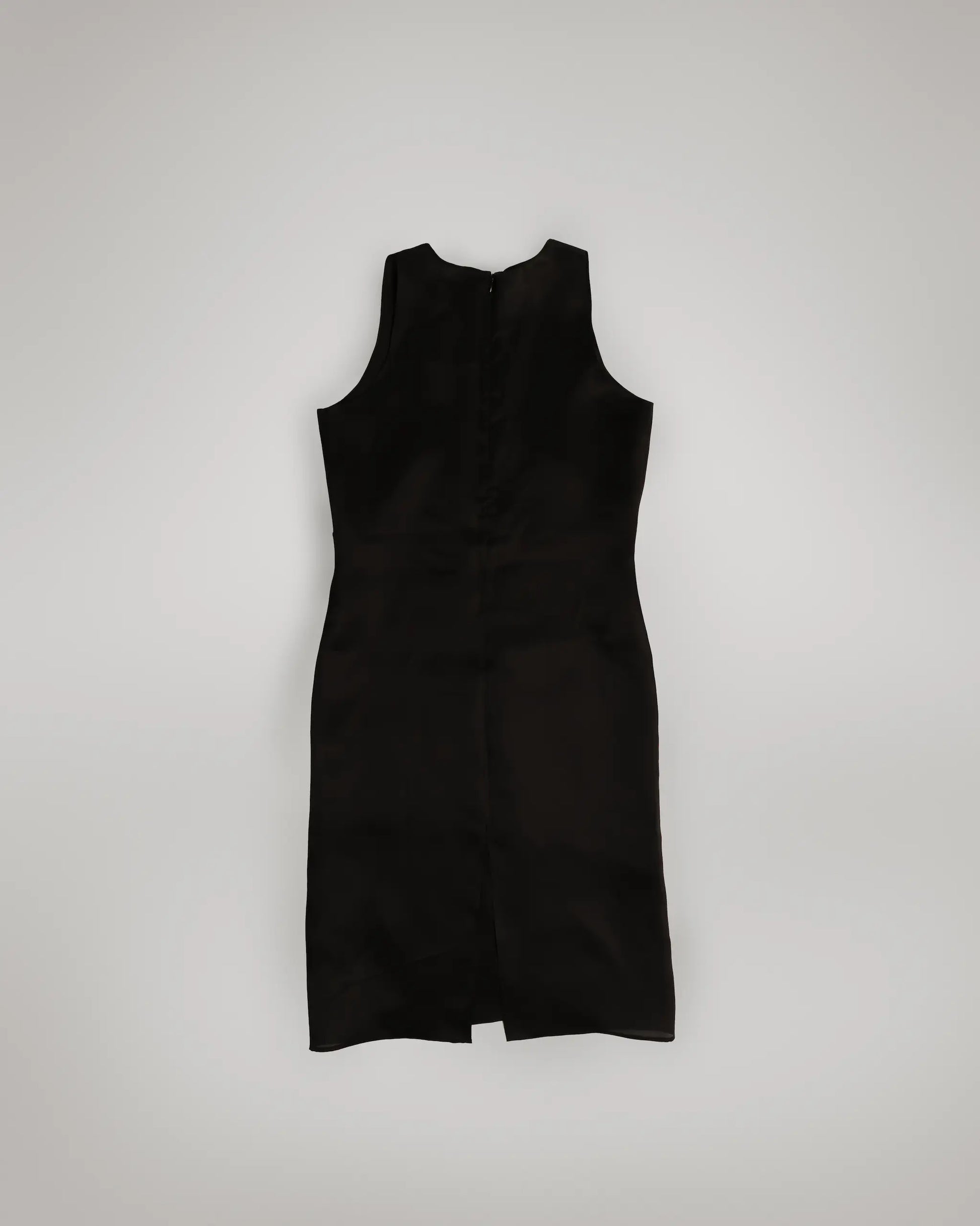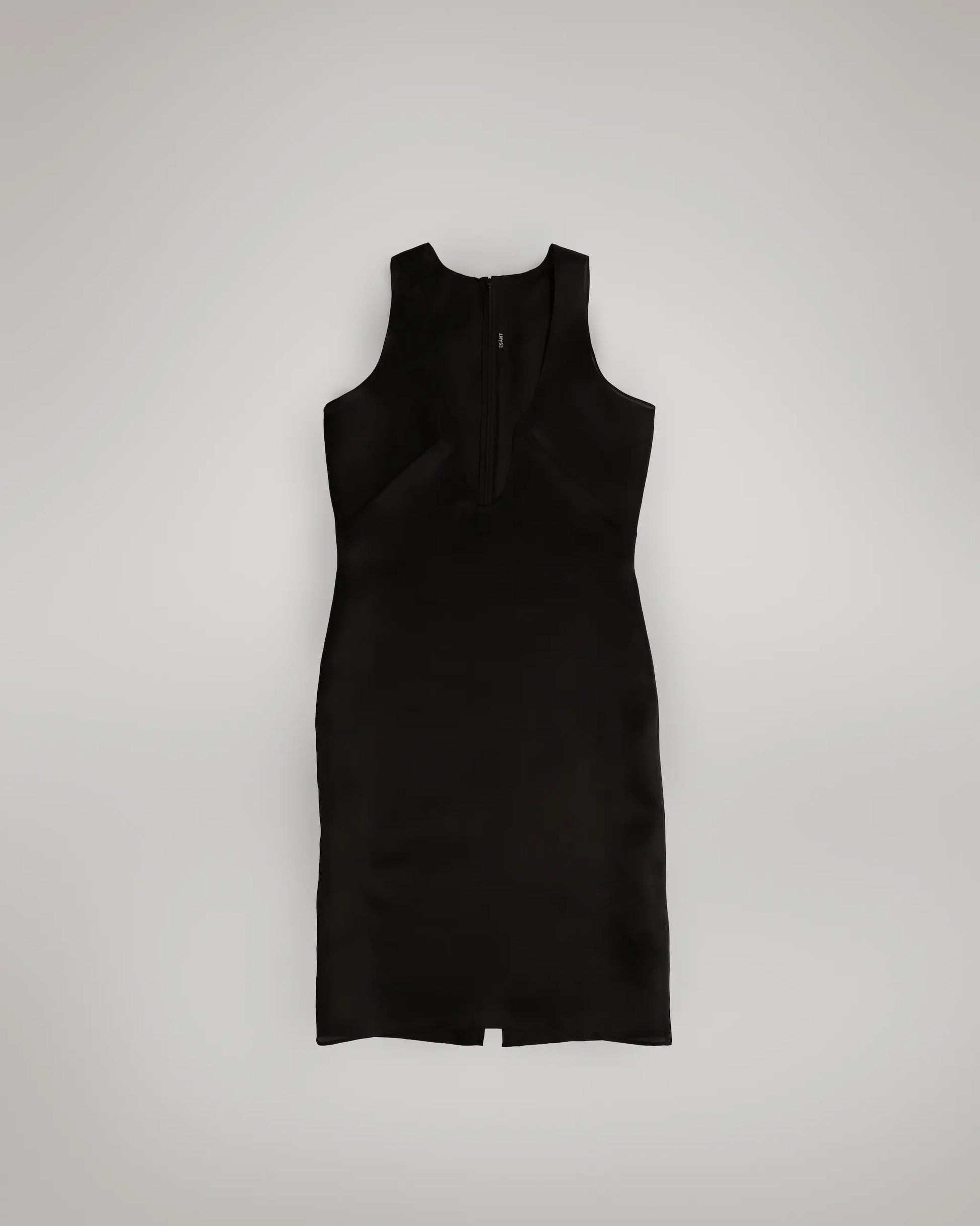 The Noor Dress features an elongated U-shaped neckline that descends cleanly across the bust, creating an open, refined curve. Diagonal darts sculpt the chest with subtle precision, guiding the silhouette into a softly structured form.